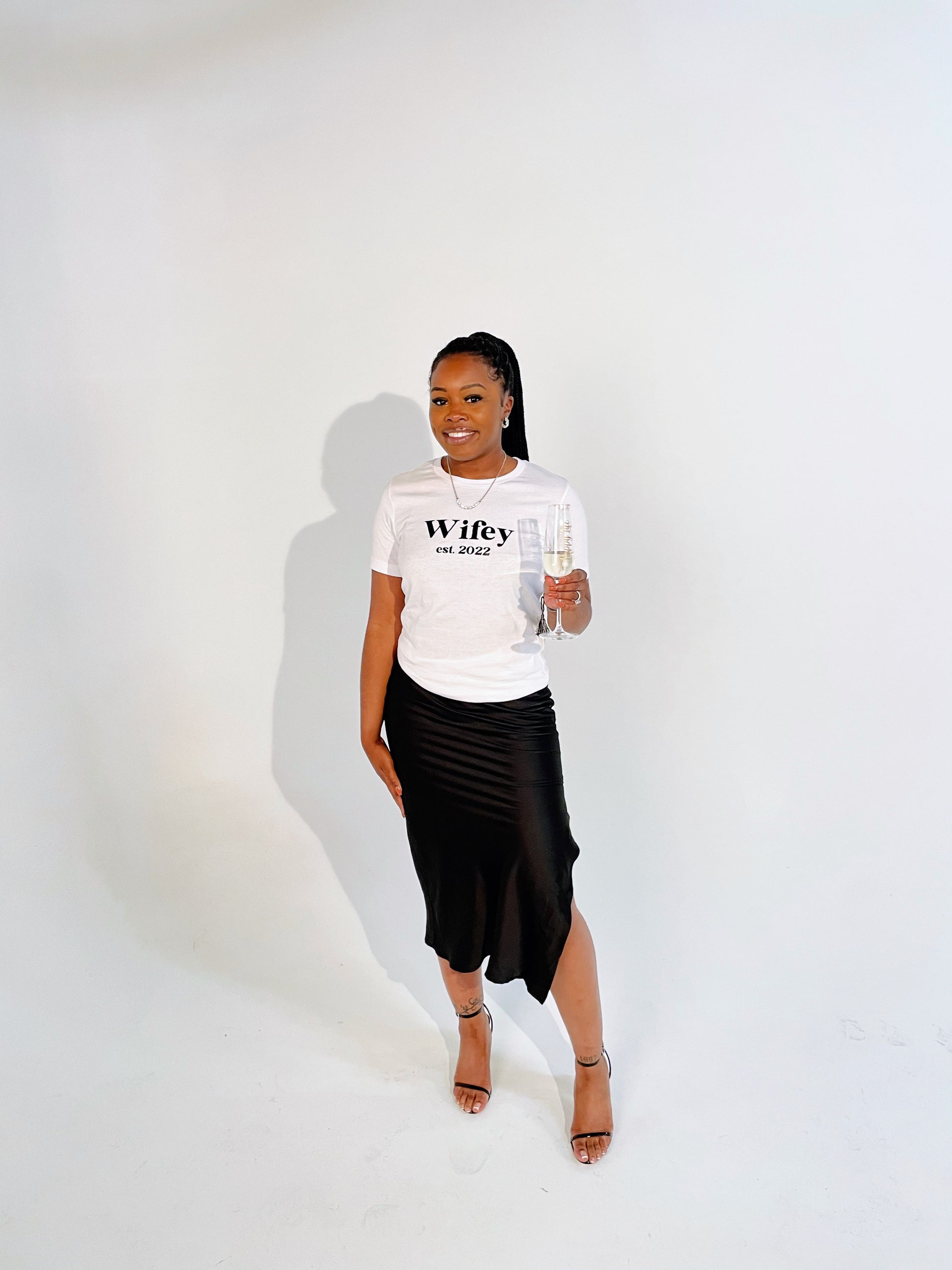 Celebrate her new journey with this bride-to-be t-shirt, featuring the trendy "Wifey Est 202X" design. Comfortable, stylish, and perfect for bridal showers, honeymoon travel, or lounging.