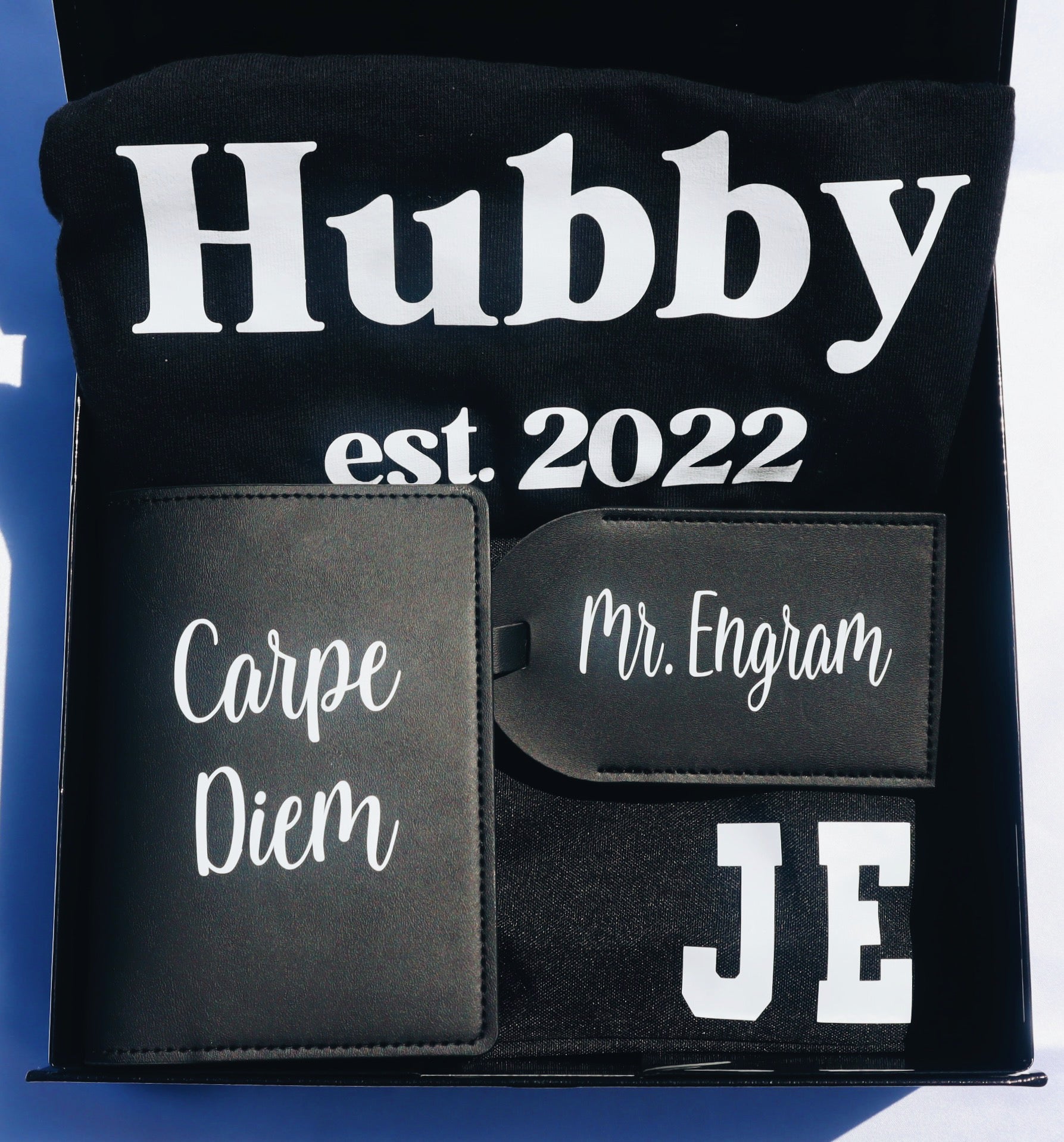 Perfect for the honeymoon, this matching set includes a personalized passport holder and luggage tag, making travel both stylish and organized. A thoughtful and practical gift that adds a personal touch to his travels.